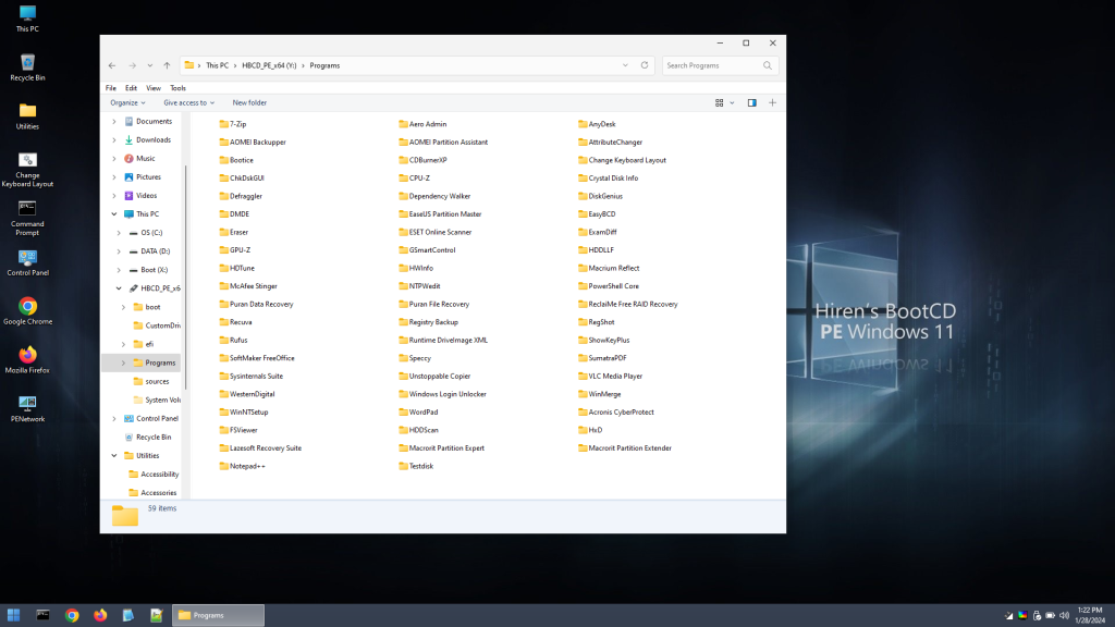 When you boot the Hiren’s BootCD PE USB Drive, you’ll find a fully functional desktop loaded with repair and recovery programs, including: